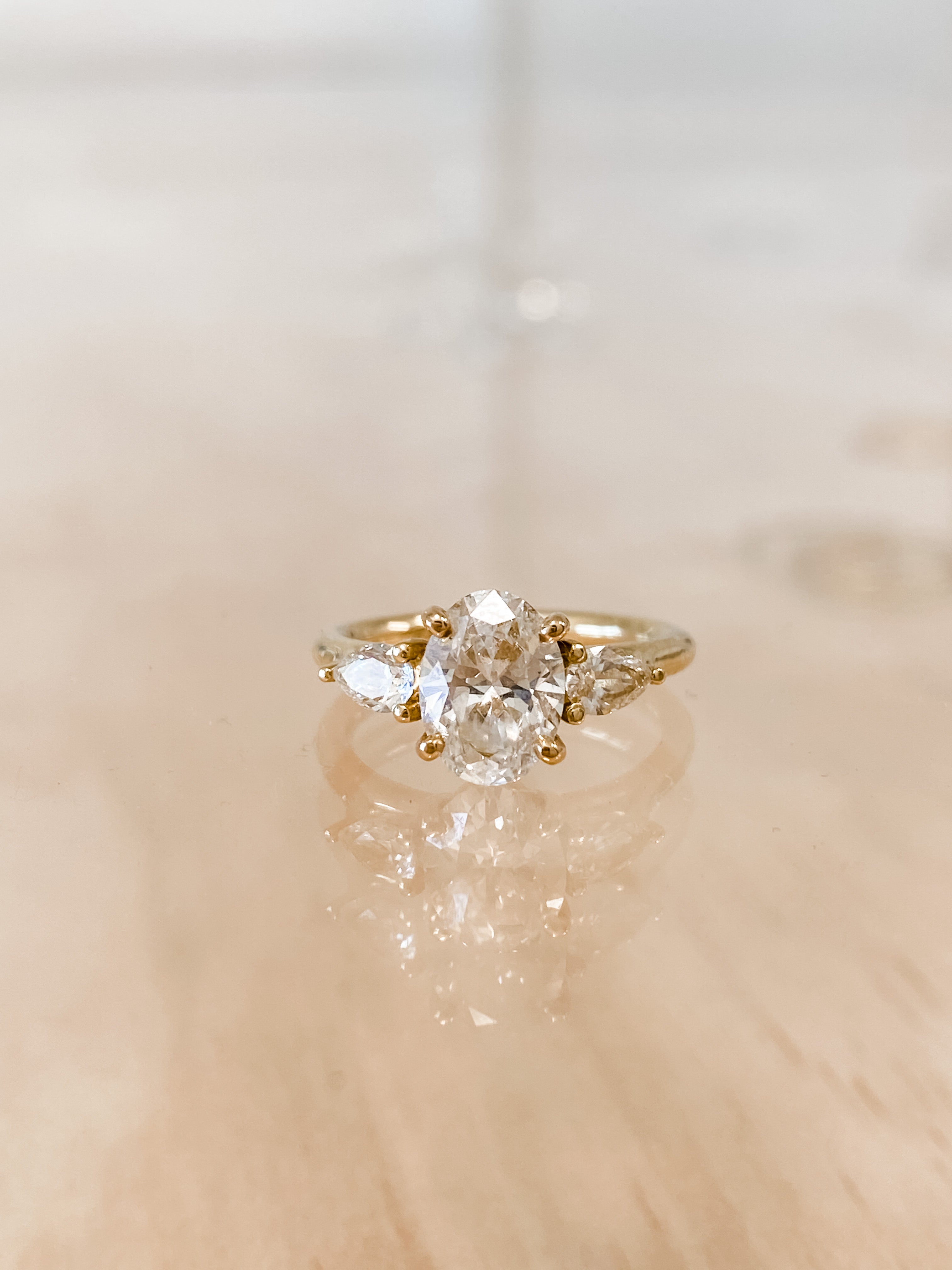 "I think we want to add two more diamonds"—may just be my favourite ever sentence. When Scott was designing Shirley's ring we were originally looking at our Clara band. Adding two pear shaped shoulder stones transformed Clara into our now much adored Ania ring.
