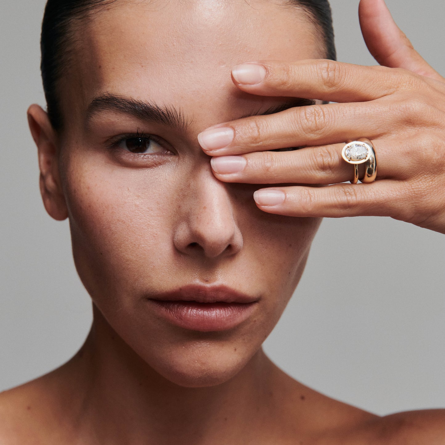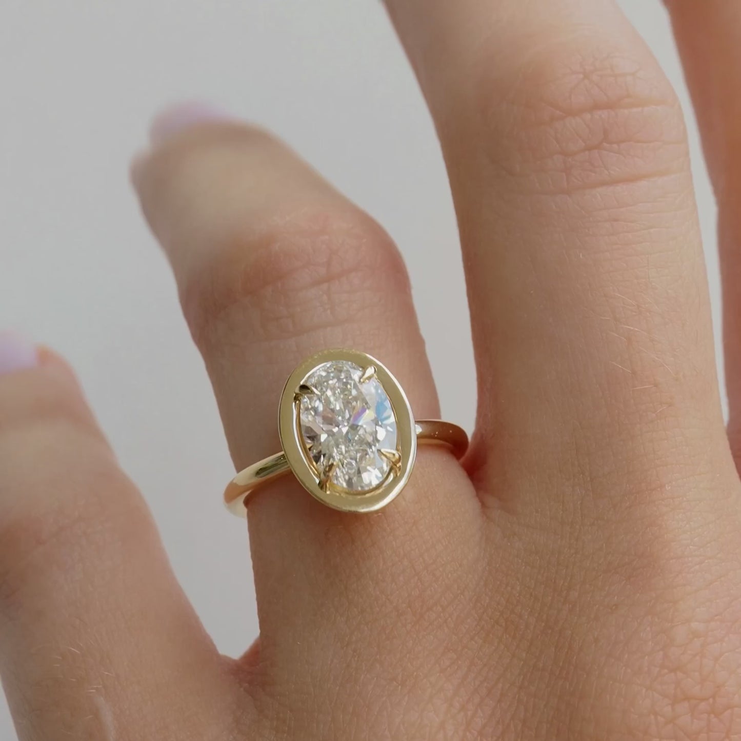 A dramatic oval solitaire featuring a solid gold halo—ready to wear