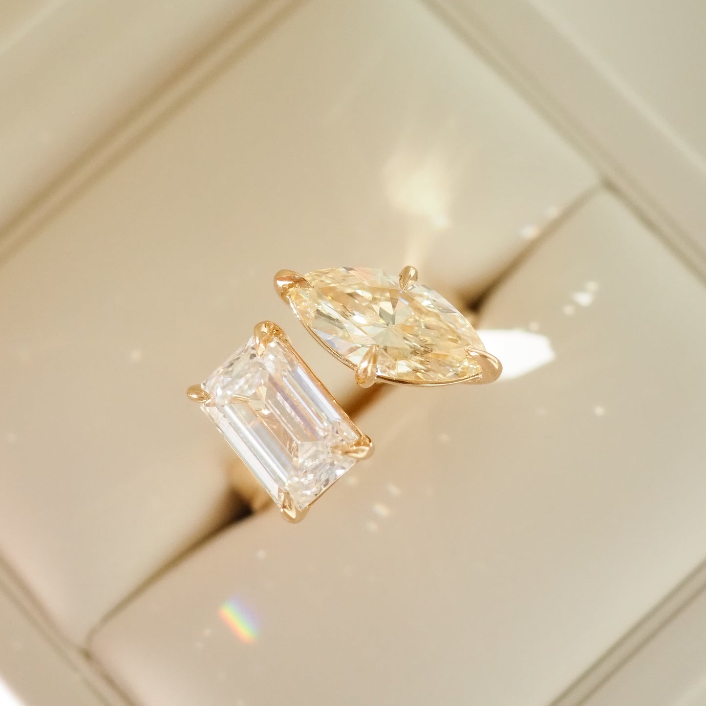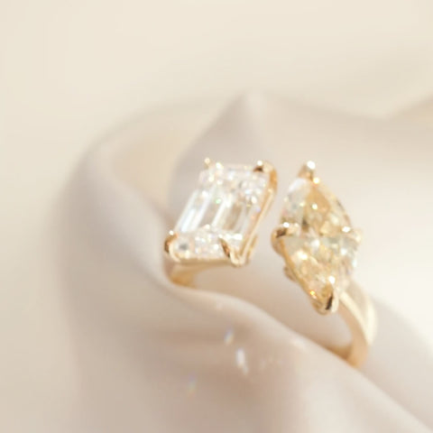 A first of its kind open band engagement ring, featuring contrasting emerald & marquise diamonds— ready to wear