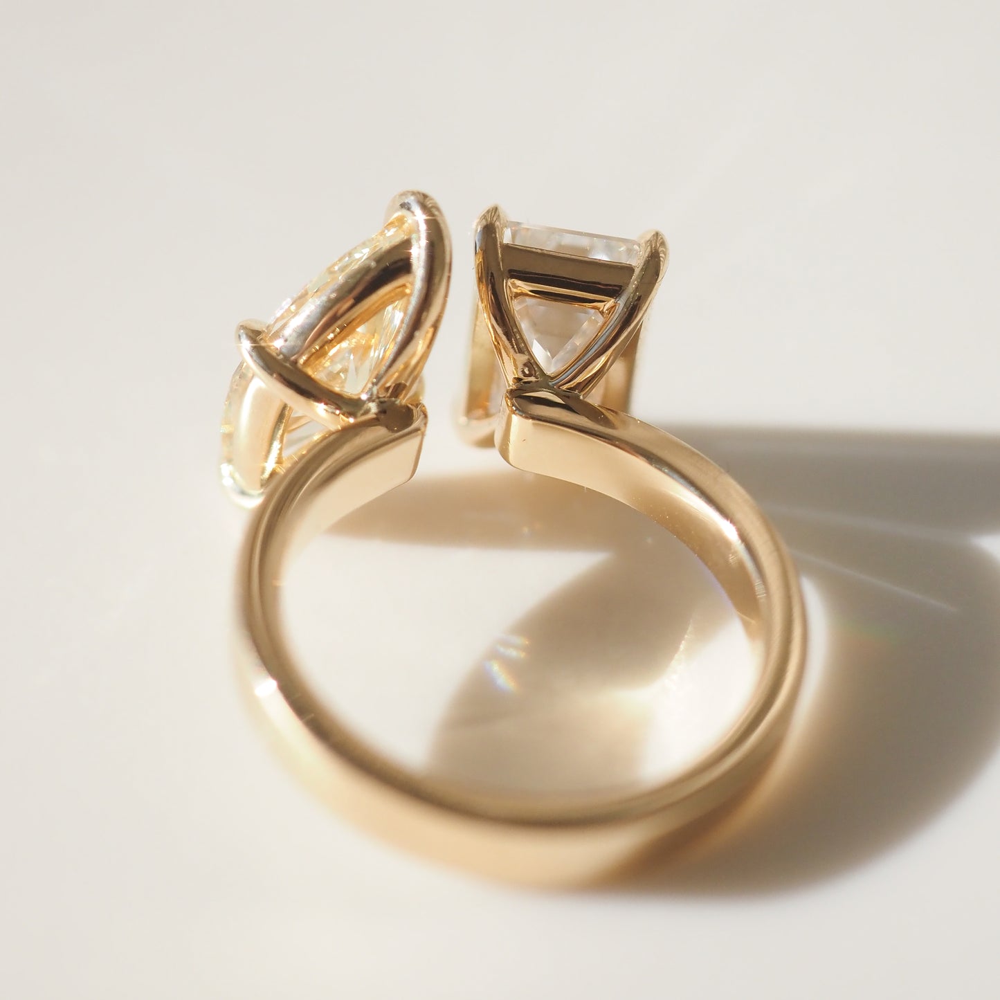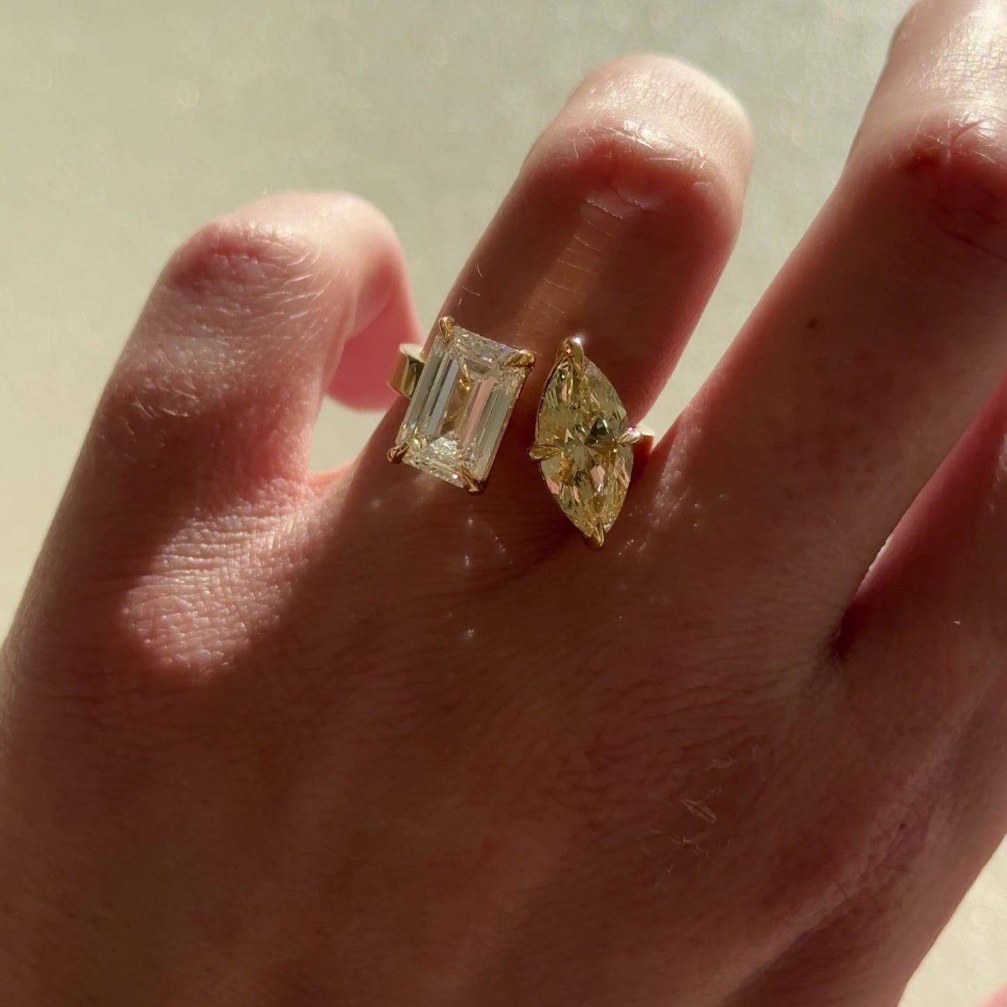 A one of a kind Toi et Moi ring featuring two perfectly proportioned 3.22ct Emerald & 2.10ct Fancy Yellow Marquise lab-grown diamonds.